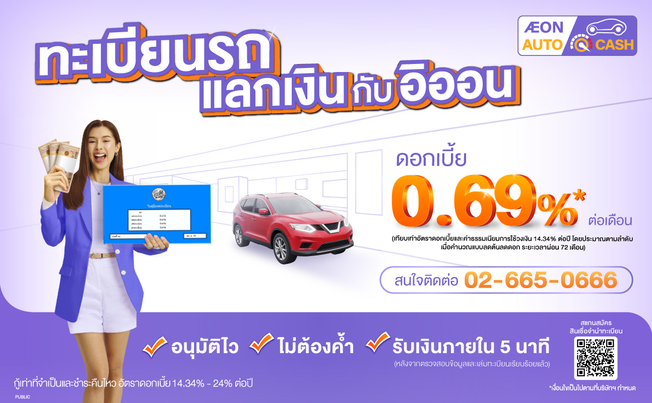 ต้องการเงินสดทะเบียนรถช่วยได้กับสินเชื่ออิออน ออโต้ ควิกแคช สมัครง่าย อนุมัติภายใน 30 นาที ผ่อนนานสูงสุด 72 เดือน ดอกเบี้ยเพียง 0.69% ต่อเดือน (อัตราดอกเบี้ยที่แท้จริง 14.34% ต่อปี) เมื่อคำนวนแบบลดต้นลดดอกระยะเวลาผ่อนชำระ 72 เดือน เริ่มวันที่ 1 มีนาคม 2568 - 28 กุมภาพันธ์ 2569 เท่านั้น