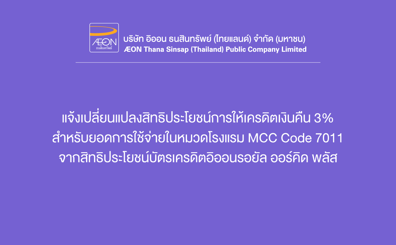 บริษัทฯ ขอแจ้งเปลี่ยนแปลงเงื่อนไขสงวนสิทธิ์ยกเว้นการมอบเครดิตเงินคืน 3% สำหรับรายการใช้จ่ายหมวดโรงแรม (MCC Code 7011) จากสิทธิประโยชน์ในบัตรเครดิตอิออน รอยัล ออร์คิด พลัส