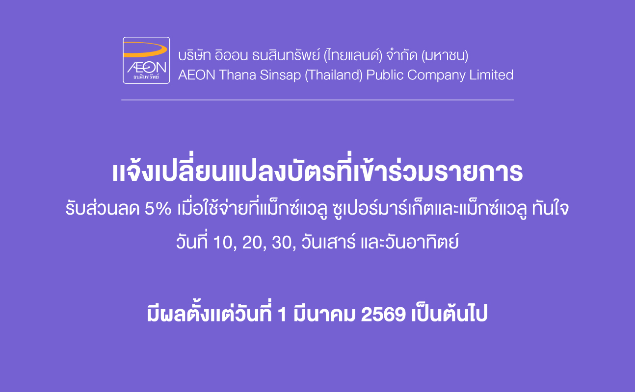 บริษัท อิออน ธนสินทรัพย์ (ไทยแลนด์) จำกัด (มหาชน) (“บริษัทฯ”) เเจ้งเปลี่ยนแปลงบัตรที่เข้าร่วมรายการ รับส่วนลด 5% เมื่อใช้จ่ายที่แม็กซ์แวลู ซูเปอร์มาร์เก็ตและแม็กซ์แวลู ทันใจ วันที่ 10, 20, 30, วันเสาร์ และวันอาทิตย์ บัตรที่ร่วมรายการดังนี้ บัตรเครดิตอิออน โกลด์ และบัตรเครดิตอิออนคลาสสิค