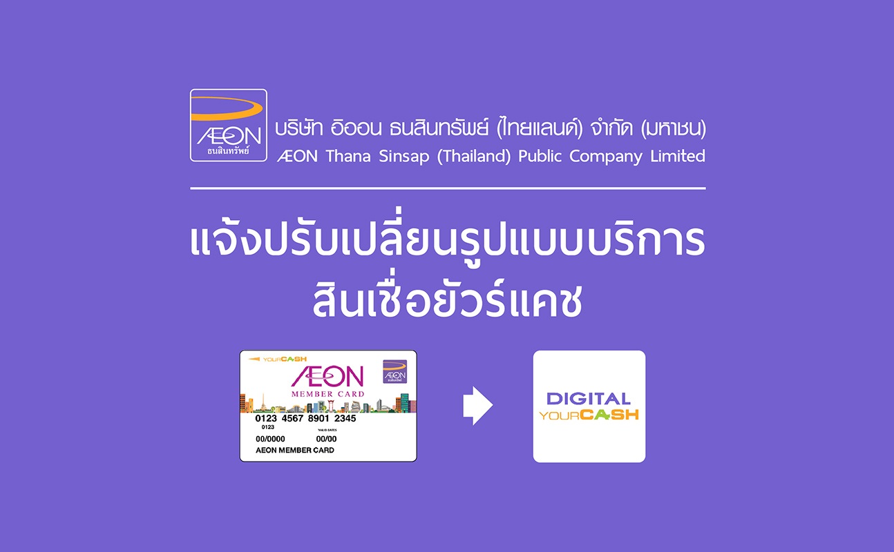 บริษัท อิออน ธนสินทรัพย์ (ไทยแลนด์) จำกัด (มหาชน) (“บริษัทฯ”) ในฐานะผู้ให้บริการสินเชื่อส่วนบุคคล ซึ่งเป็นผู้ออกบัตรสมาชิกอิออน (“บัตรสมาชิก”) ให้กับท่าน มีความประสงค์ที่จะยกระดับบริการสินเชื่อส่วนบุคคลเพื่อตอบสนองต่อความก้าวหน้าทางด้านเทคโนโลยีดิจิทัล (Digital Technology) และลดการก่อมลภาวะต่อสิ่งแวดล้อม โดยบริษัทฯ มีกำหนดการที่จะปรับเปลี่ยนรูปแบบการใช้บริการสินเชื่อยัวร์แคช (Your Cash) จากการใช้งานผ่านบัตรพลาสติก มาเป็นบัญชีสินเชื่อดิจิตอล ยัวร์แคช (Digital Your Cash) ผ่านอิออนไทยโมบายแอปพลิเคชัน (AEON THAI MOBILE) ตั้งแต่วันที่ 1 พฤษภาคม พ.ศ. 2565 เป็นต้นไป โดยท่านสมาชิกยังสามารถทำรายการเบิกถอนเงินสด ผ่อนชำระค่าสินค้าและบริการ รวมถึงบริการหักชำระเงินอัตโนมัติผ่านบัตรสมาชิกประเภทบัตรพลาสติกได้จนถึงวันที่ 30 เมษายน พ.ศ. 2565