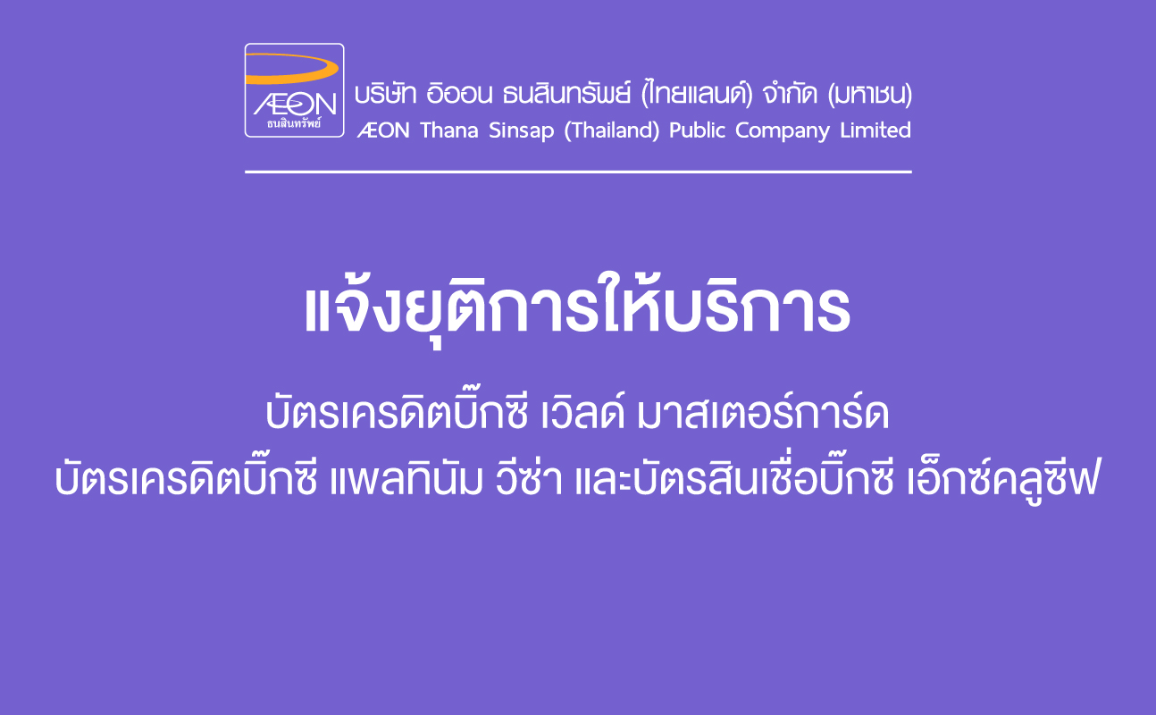 ในการนี้ บริษัทฯ มีความพร้อมและยินดีให้บริการทางการเงินแก่ท่านต่อไป สำหรับผู้ถือบัตรที่ต้องการสมัครบัตรเครดิต บริการผ่อนชำระ และสินเชื่อส่วนบุคคลอื่น ๆ ของบริษัทฯ ท่านสามารถดำเนินการได้ผ่านแอปพลิเคชัน AEON THAI MOBILE หรือที่สำนักงานสาขาของบริษัทฯ ทั่วประเทศภายใต้เงื่อนไขที่บริษัทฯ กำหนด