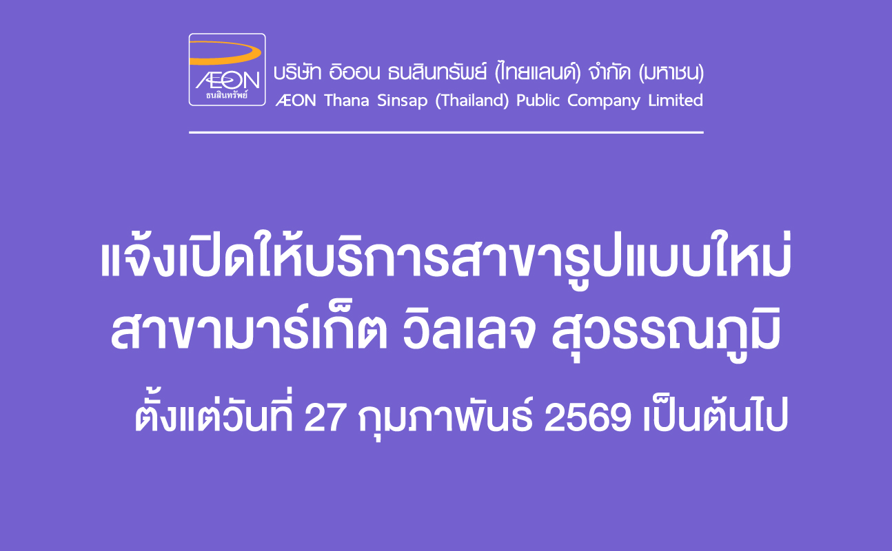 บริษัท อิออน ธนสินทรัพย์ (ไทยแลนด์) จำกัด (มหาชน) ขอเรียนให้ท่านทราบว่า อิออนสาขาร์เกจวิลเลจ สุวรรณภูมิ ชั้น 3 จะเปิดให้บริการในรูปแบบใหม่ ตั้งแต่วันที่ 27 กุมภาพันธ์ 2569 เป็นต้นไป