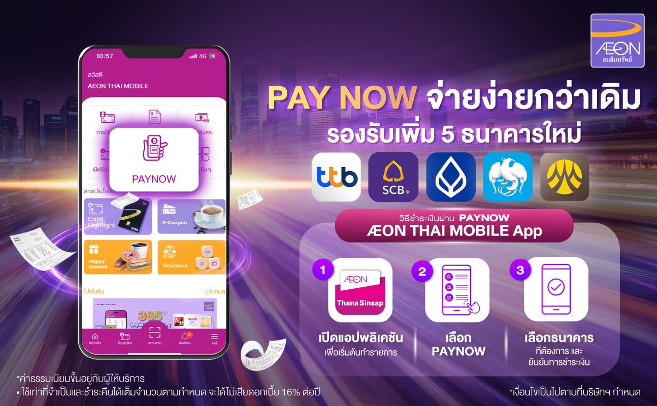เพิ่มบริการ PAYNOW โดยขยายช่องทางการชำระเงินกับ 5 ธนาคาร ผ่าน AEON THAI MOBILE สะดวกกว่ายิ่งขึ้น ! แค่เพียงคุณมีแอปธนาคารที่ร่วมรายการ คุณก็สามารถทำรายการชำระเงินค่าบัตรเครดิต สินเชื่อได้ และวงเงินคืนเข้าระบบทันที