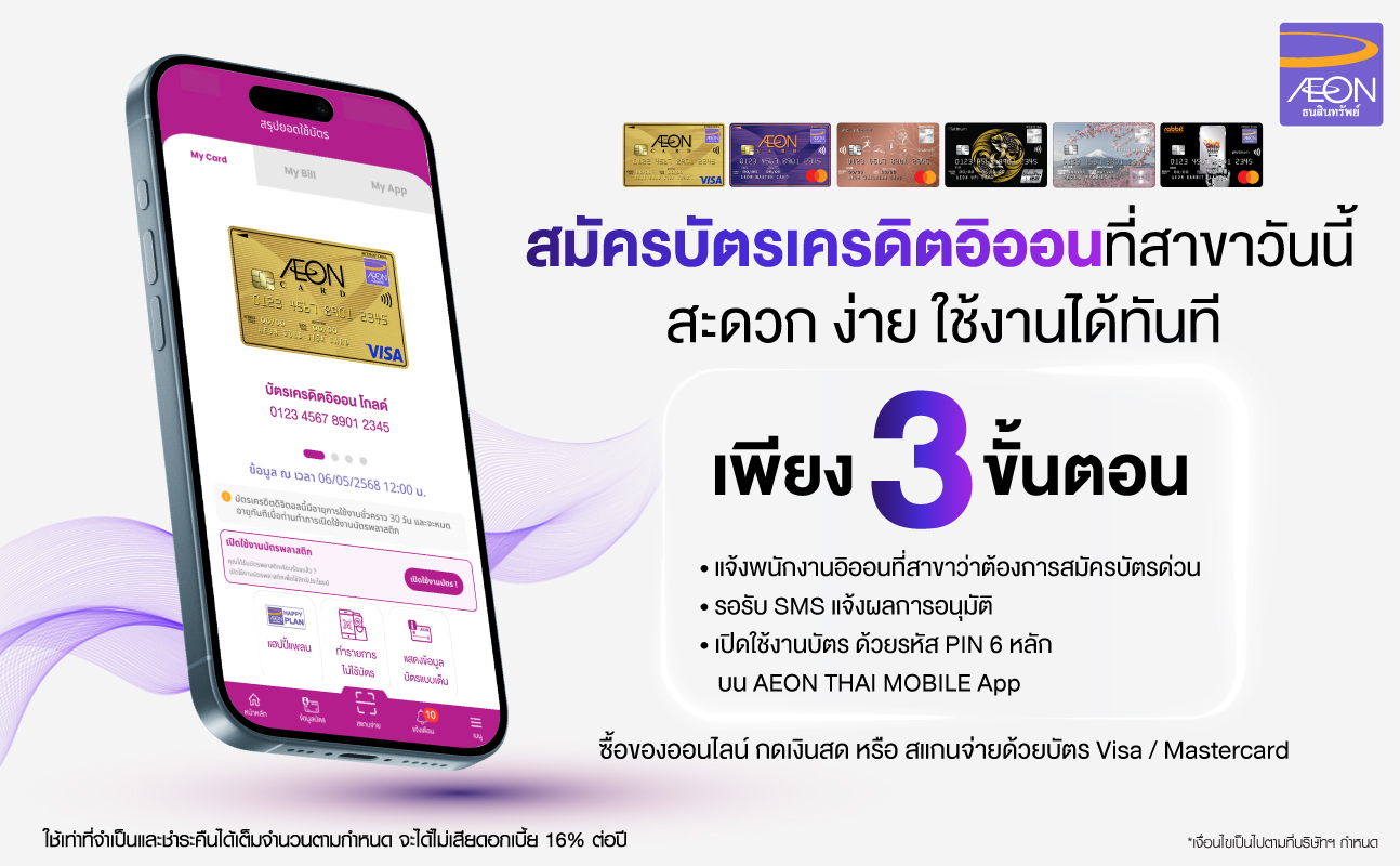 คุณจะได้รับบัตรเครดิตชั่วคราวแบบดิจิทัล บน AEON THAI MOBILE APP หลังอนุมัติทันที ใช้ได้เลย ไม่ต้องรอบัตรพลาสติก