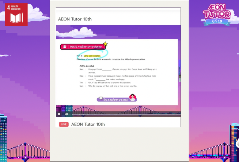 กิจกรรมนี้เป็นไปตาม SDGs4 เพื่อสร้างหลักประกันว่าทุกคนมีการศึกษาที่มีคุณภาพอย่างครอบคลุมและเท่าเทียม และสนับสนุนโอกาสในการเรียนรู้ตลอดชีวิต การติวในรูปแบบออนไลน์ทำให้นักเรียนจากทั่วประเทศสามารถเข้าถึงได้ เป็นการส่งเสริมการศึกษาที่เท่าเทียมและมีประสิทธิภาพอย่างทั่วถึง